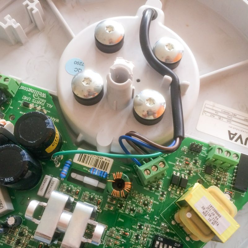 Leg de unit met ronddraaiende ventilatorbladen naar beneden neer. Met de torx-schroevendraaier draai je de 4 schroeven van de motor los. Til voorzichtig de plastic behuizing met printplaat op, help hierbij de motorkabel door het zwarte gat met rubber.