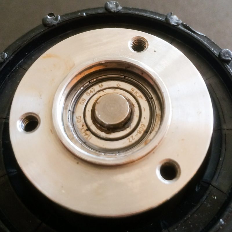 Aluminium ding komt niet los! Ik heb aluminium ding met de lagers er met 2 stevige schroevendraaiers uit gekregen door de schroevendraaiers aan beide kanten van het aluminium ding er zonder te steken en dan als een hefboom omhoog te wrikken. Verstandig om er een latje hout tussen te doen zodat het plastic (gehele motor) of aluminium (alleen onderste gedeelte motor) niet beschadigd. Het plastic gedeelte van de motor kan er ook nog af, zie stap 8 hieronder.